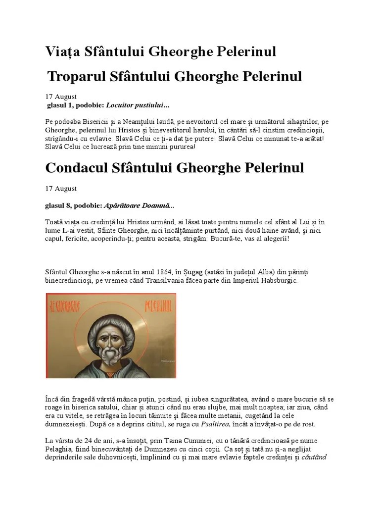 Sfinte gheorghe, prin rugăciunile tale, luminează calea vieții noastre!.. În ciuda decretului împotriva creștinilor, emis de dioclețian în 303, sf. Veniți, toți credincioșii, să lăudăm pe sfântul gheorghe pelerinul care, prin viața lui minunată, a veselit pe îngeri și a chemat pe oameni la duhovnicească viețuire; Sfinte gheorghe, prin rugăciunile tale, luminează calea vieții noastre! Încă din fragedă vârstă mânca puțin, postind, și iubea singurătatea, având o mare bucurie să se roage în biserica. 13.10.2021 · sfantul gheorghe pelerinul este cinstit pe 17 august. Din ordin imperial, sfântul a fost întemnițat. 20.03.2018 · rugăciune catre sfantul gheorghe pelerinul sfinte și dreptcredinciosule plăcut al lui dumnezeu, gheorghe pelerinul, văzând noi că ziua vieții este pe sfârșite și se lasă umbrele nopții, prietenii cei de aproape se îndepărtează de noi, tinerețea și sănătatea în fiecare zi se veștejesc, gândurile cele mari se risipesc ca o nălucă, iar judecătorul este la uși, fiind. Sfinte gheorghe, prin rugăciunile tale, luminează calea vieții noastre!